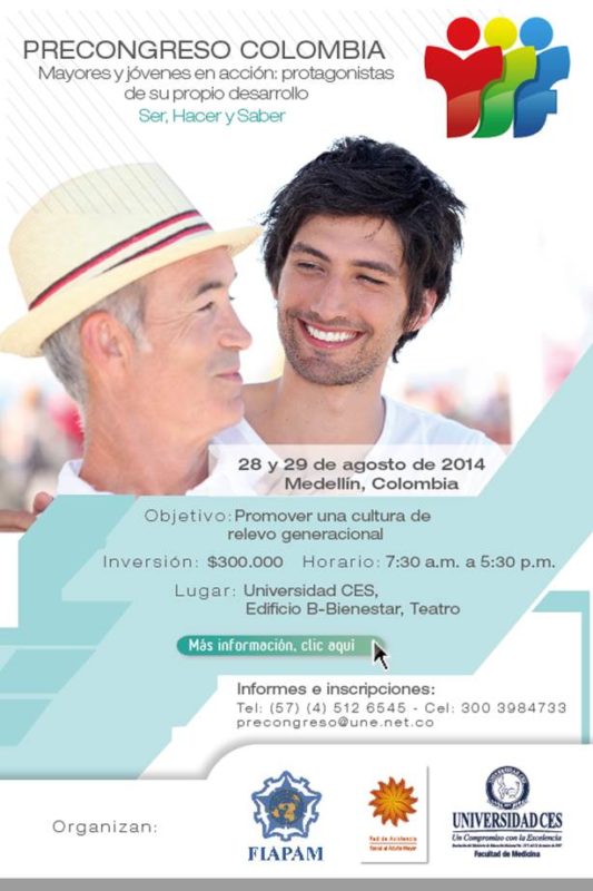 Medellín (Colombia), 29 de maio de 2014. FIAPAM-Colombia, junto com a Rede de Assistência Social ao Adulto Maior (Medellín), la Organizaçã0 Ibero-americana de Seguridade Social-OISS e a Universidade CES, organizaram o II Pré-Congresso Colombia, evento que com o lema “Ser, fazer e saber” terá lugar nos próximos días 28 e 29 de agosto em Medellín. O evento, preâmbulo do VI Congresso da FIAPAM, se dirige a pessoas e instituições que trabalhem e desenvolvem atividades e estudos com jovens e pessoas maiores, sendo os objetivos do Pré-Congresso: